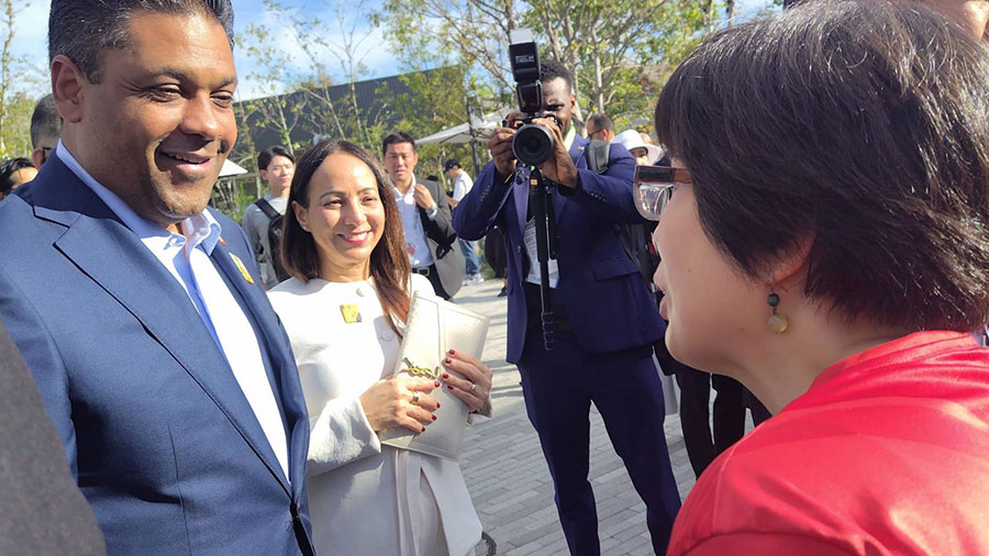 10月11日のハイチのナショナルデーに合わせ大阪・関西万博を訪れたサン=シル暫定大統領評議会議長㊧に思いを伝えました(筆者提供)