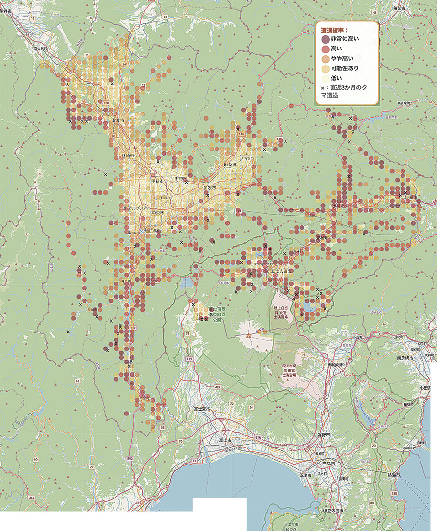 公開されているマップは山梨県を含め19地点(11月18日時点、図)。マップ上に表示されている丸印(○)は、遭遇確率を色の濃さで、Ⅹは直近で実際にクマに遭遇した場所をそれぞれ表しています。