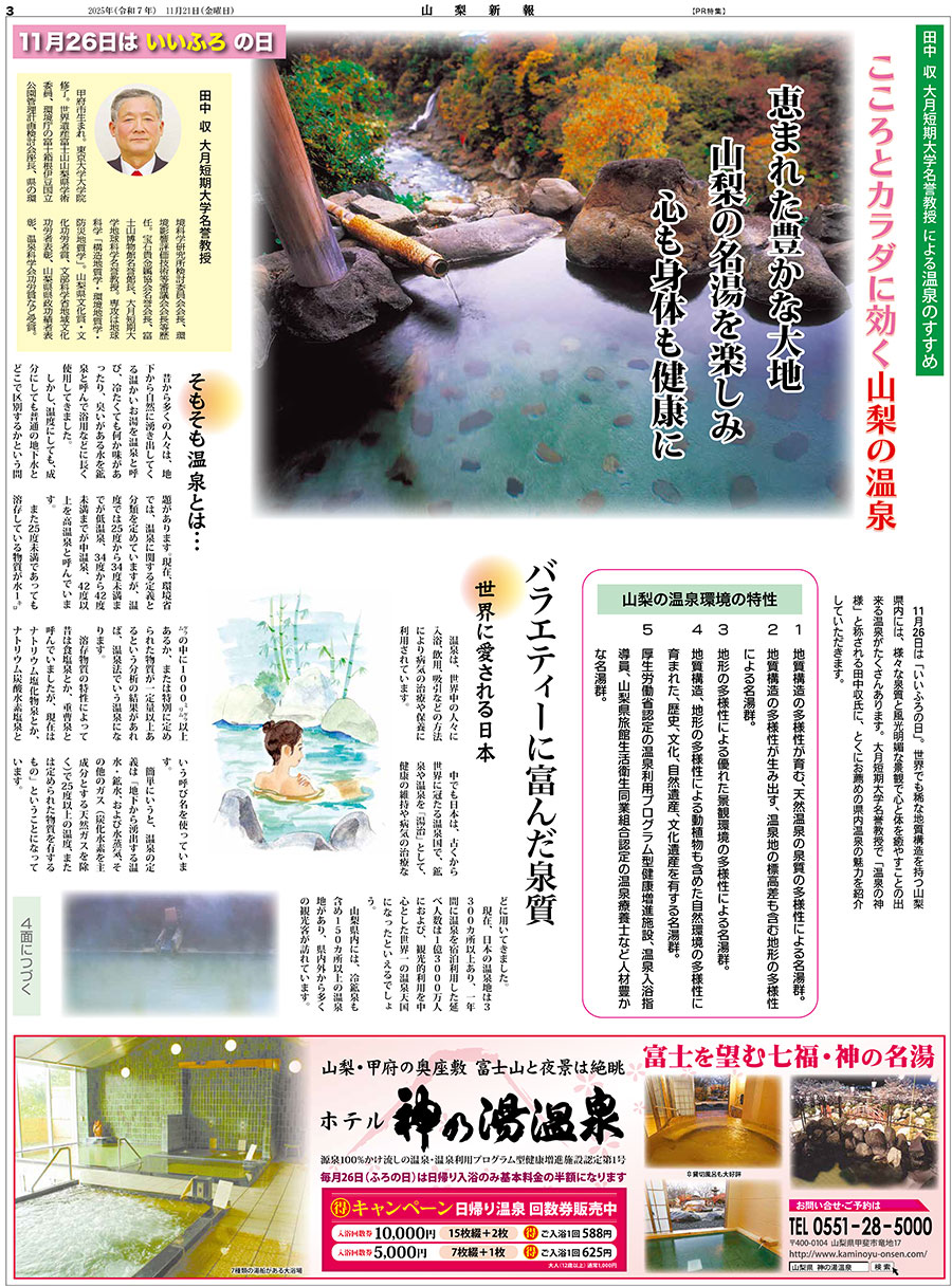 11月26日は「いいふろの日」。世界でも稀な地質構造を持つ山梨県内には、様々な泉質と風光明媚な景観で心と体を癒やすことの出来る温泉がたくさんあります。大月短期大学名誉教授で「温泉の神様」と称される田中収氏に、とくにお薦めの県内温泉の魅力を紹介していただきます。